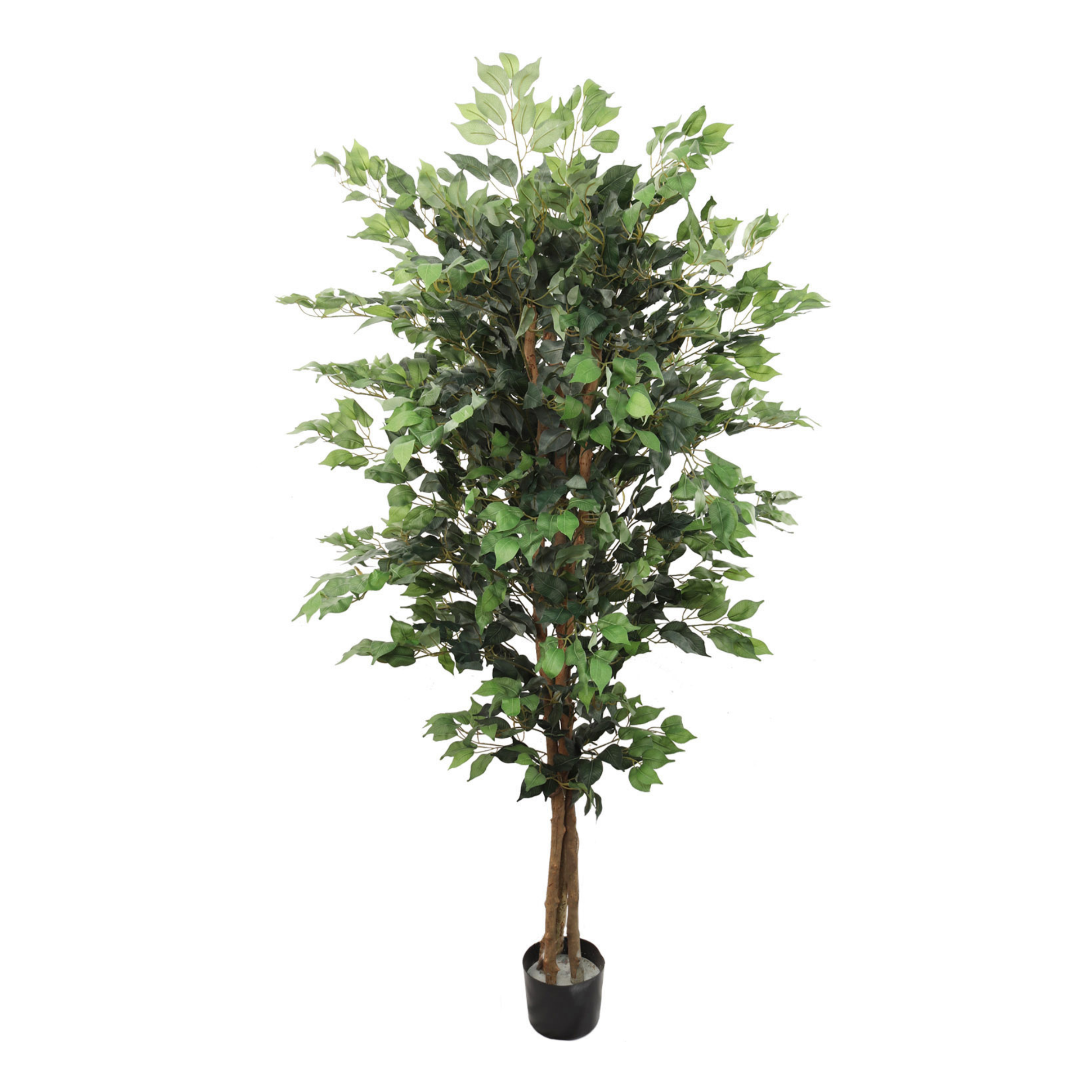 Standing tall at 6 feet, this artificial Ficus tree showcases a verdant canopy of 1512 silk leaves meticulously arranged to emulate the graceful foliage of the Ficus, offering a striking visual focal point for any space.